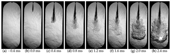 The vision system outputs 12-bit depth grayscale images. The intensity value of each pixel has therefore values from 0 to 4095, where 0 is represented as black and 4095 as a white color. The selected frame rate is 15,000 frames per second (FPSs), which allows to obtain continuous images every 66.67 s. This sample time is small enough to capture the dynamics of the fuel spray [30]. The shutter opening time is 40 s, which allows to achieve non-blurry 896 px × 512 px images. The approximated scale between world and image units is about 10.5 px/mm, although this correlation requires to undistort the image after the camera calibration (e.g., [31,32]). The control system sends a trigger signal to the high-speed camera to start the image acquisition in a synchronous mode to the injector activation. The camera software is configured to take 10 images before the trigger and 90 after it, and 5 repetitions are taken in each test.
