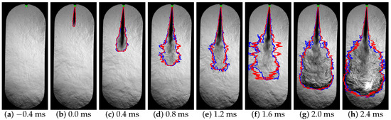 Figure 12 shows a sequence of images acquired during a diesel fuel injection event, which corresponds to an injection pressure of 50 MPa. The time each image was taken at, measured from the start of injection (SoI), is shown at the bottom of each figure. Figure 13 shows the processing of the images in Figure 12, the spray contour in blue, the injector position in green, and the symmetrical spray contour in red calculated with the presented algorithm.