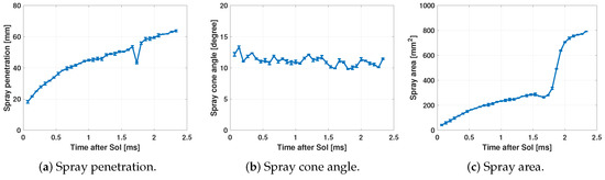 Figure 14 shows the macroscopic parameters of the fuel spray obtained by the processing of the images.