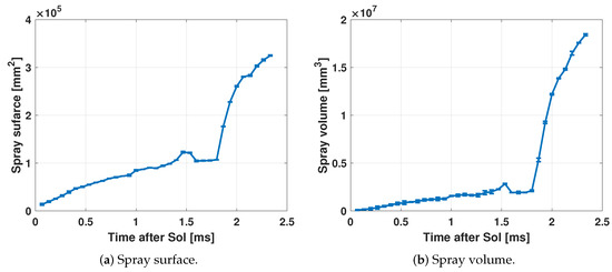 Figure 15 shows the evolution of the surface and the volume of the fuel spray estimated with the processing of the images.