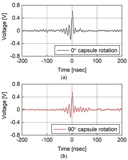 Figure 7 shows the impulse responses of the HBC channel obtained from the measurements with minced pork as a medium. As shown in Figure 7, the impulse response changes are in relation to the capsule rotation. However, the change is not significant because all responses have an absolute peak value of approximately 0.4 V and a pulse duration of approximately 10 ns. The constant response is consistent with the signal loss measurement results shown in Figure 4.