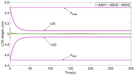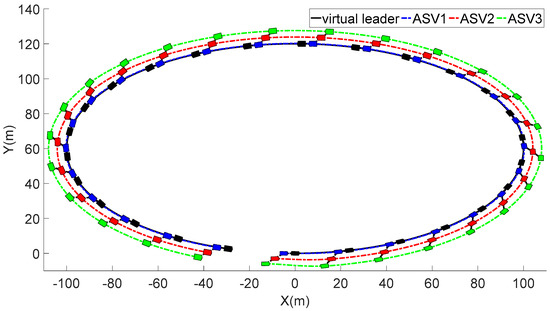 When achieving collisions and effective communication distance, Inequality (12) can be held to satisfy so that and do not hold simultaneously, which avoids the undefined point of . Even if there is some measurement error in the onboard sensors, the ASV formation will work equally well as long as the distance between the ASVs remains within the communication range.