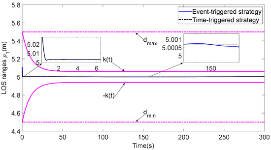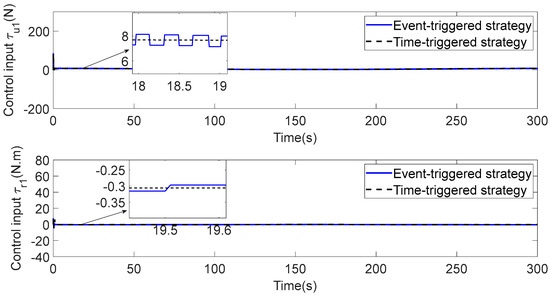 In Figure 3, each ASV tracks its leader while maintaining the desired distance between a group of leaders and followers. The LOS range and angle error satisfy the prescribed performance specification, realize the connectivity of formation control communication and avoid collision, as shown in Figure 4 and Figure 5. Figure 6, Figure 7 and Figure 8 show the control input with the event-triggering mechanism. In Figure 6, Figure 7 and Figure 8, the control inputs of each ASV are continuous and chattering-free. The control input of ASV1 based on time-triggered development is continuously updated, as shown in Figure 9. The tracking performance of the time-triggered control of ASV1 is shown in Figure 10 and Figure 11. As shown in Figure 9, Figure 10 and Figure 11, compared with time-triggered control, the event-triggered control strategy has better control performance and saves more communication resources. The triggering effect of the proposed event-triggered strategy based on the relative threshold is shown in Table 3 and shows that the proposed event-triggered strategy can save considerable communication bandwidth.