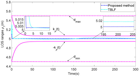 From (13), the tracking error performance is consistent with the distance error performance. When the distance error converges to near the desired distance, the tracking error converges to a small region near zero.