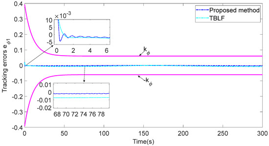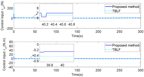 In addition, to verify the performance of the proposed control strategy, it is compared with the tan-type Lyapunov function (TBLF) control strategy in [12]. From Figure 12, compared with the TBLF strategy, this control method has a smaller tracking error and faster convergence rate. The maximum steady-state error of the proposed control method does not exceed 0.005, but the maximum of the TBLF strategy can reach approximately 0.02. As shown in Figure 13 and Figure 14, when the control input is basically the same, the angle tracking error of the control algorithm in this paper is less than that of TBLF method. In summary, the control system designed in this paper has good control performance and saves considerable communication resources.