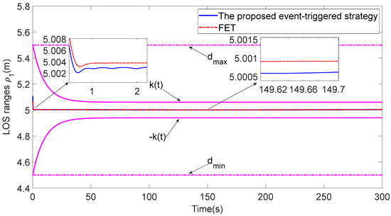 Compared with the analysis of the fixed-threshold event-triggered strategy (FET) [26], the event-triggered strategy based on the relative threshold proposed in this paper can greatly reduce the communication resources used by the system. As shown in Figure 15 and Figure 16, the proposed event-triggered strategy based on the relative threshold has a faster response speed and better tracking accuracy. As shown in Table 3, using the FET method, the percentages of ASV1 communication triggers in the total communication time are changed from 4.44% and 3.52% to 4.51% and 4.07%, respectively, which indicates that the proposed strategy can save more communication resources than the FET method.