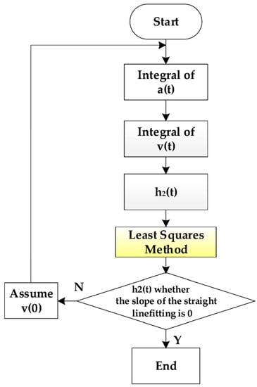 In Equation (2), h2(0) is a constant, which does not affect the profile curve shape of the road surface, a(t) is the acquired value of the accelerometer, and v(0) is a slope linear function superimposed on h2(t), which is equivalent to a sloped road surface and needs to be calculated. The least squares method [] can be used to calculate v(0), that is, it is considered that the overall trend of the measured road surface between the measurement start point and the endpoint is a flat road with a slope of 0. The calculation process of v(0) is shown in Figure 5.