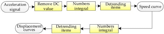 Acquisition of acceleration signals has used the method of temperature and humidity compensation to reduce the influence of the environment on the signal, but when the acceleration is used to calculate the velocity and displacement, there are also interferences from DC-components, integral accumulation, and trend items, so it is necessary to calculate the velocity and displacement of the acceleration time algorithm optimization. The specific optimization algorithm flow chart is shown in Figure 7.