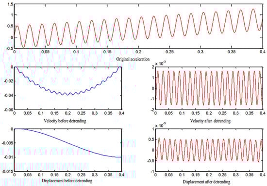 Removing the velocity trend term is most effective when the value of n is set to 2; when n is set to 3, removal of the displacement trend term is most effective. According to Figure 10, it can be seen that by removing the trend items of acceleration and velocity, relatively correct velocity and displacement curves can be obtained. If the trend items are not removed, there will be a large overall drift of the signal, and the real information cannot be restored.