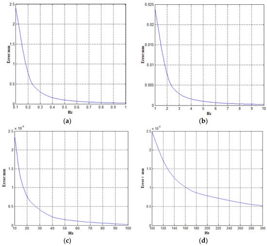Measurement error curve of acceleration sensor. (a) 0.1~1 Hz error curve; (b) 1~10 Hz error curve; (c) 10~100 Hz error curve; (d) 100~300 Hz error curve.