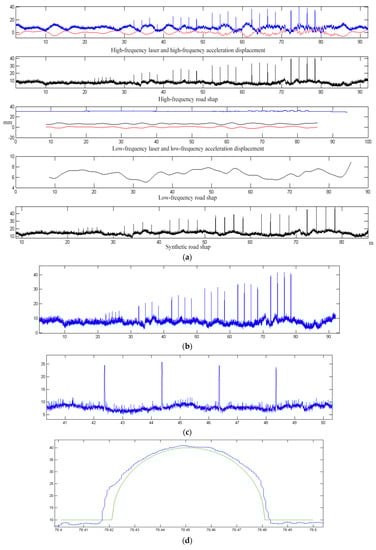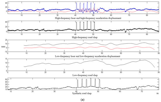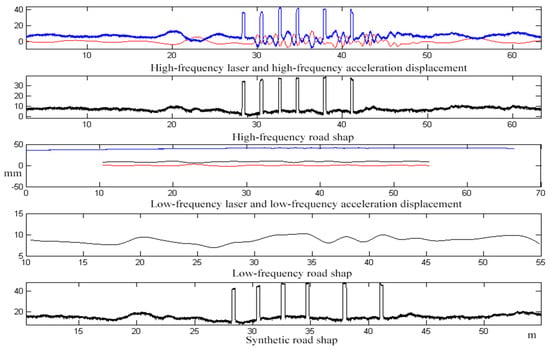 For the centimeter-meter level road shape undulation on the road surface, when the laser displacement sensor and the acceleration sensor are used to detect the road shape, the comprehensive error is mainly composed of the sensor acquisition error and the algorithm error. In this case, the comprehensive measurement error is composed of acceleration integration algorithm error, laser displacement sensor measurement error, acceleration sensor measurement error, and measurement error caused by vehicle attitude (measurement error caused by pitch angle, measurement error caused by roll angle).