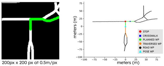 A global planner is implemented based on traditional graph search algorithms. This is performed by utilizing Global Navigation Satellite System (GNSS) traces to fetch and download open-source OSM data (https://www.openstreetmap.org/, accessed on 26 July 2023). Each OSM is saved in an Extensible Markup Language (XML) format, which encodes map connectivity information. This format is parsed and post-processed to populate a graph with full road connectivity, where distance and road element information is preserved. In practice, we perform a projection from a geographic coordinate system into a Cartesian space by using the Haversine distance formula to approximate the relative distance on a sphere (earth). This approximation allows us to characterize a graph search strategy that is performed on a plane and assign weights based on units of meters, and also perform an egocentric transformation based on the position and orientation of the agent on the map. An example of this transformation can be seen in Figure 2, where we visualize the vehicle-centric rasterized (left) and vectorized (right) representations that are utilized in our work.