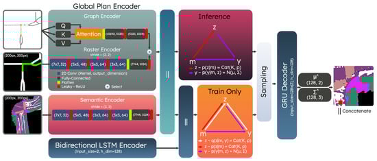 To characterize the objective function desired as part of the optimization process, the CVAE approach also introduces a recognition model denoted by . This distribution is utilized only during the training process of the model and is not used in testing. The intuition behind this distribution is that during training, it has access to ground truth trajectory information () and can be jointly optimized with by utilizing the Kullback–Leibler (KL) divergence. This process guides in the training process and can be used at test time without ground truth. The pipeline for training and testing is shown in Figure 4; where we base our architecture in a similar way as [35]. The overall objective function used in practice is derived as a combination of the standard CVAE formulation with an added Mean-Squared-Error (MSE) term to minimize displacement error, as shown in Equation (3).