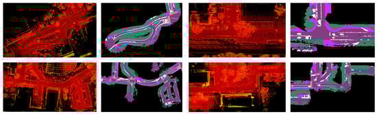 With the data collection process described, various datasets are curated at the UC San Diego campus. The NominalScenes dataset [9] includes urban driving data with global plan and semantic maps in various driving scenarios such as curved roads, loops, and intersections. On the other hand, the IntersectionScenes dataset [10] includes global plans and semantics for intersection-specific scenarios such as three-way and four-way intersections. We use these datasets to train and test the performance of our methods. We additionally make our implementation and benchmark publicly available (https://github.com/AutonomousVehicleLaboratory/coarse_av_cgm.git, accessed on 26 July 2023). The visualizations of the point cloud maps used in the semantic mapping process are shown in Figure 5 alongside the output semantic maps.