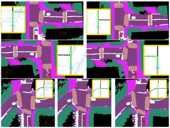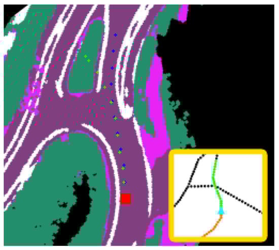Recent developments in the semantic segmentation and sensor fusion literature have enabled methods for scene understanding that seek to build scene representations with highly detailed and accurate localization of road features without manual input. For example, [30,31] focuses on generating 2D bird’s eye view semantic scene representations from monocular camera streams. While these present advantages for real-time scene understanding, they still present considerable limitations in terms of occlusions and localization errors of road futures. Alternative offline methods [32] can address some of these limitations through a spatiotemporal fusion process that leverage camera and LiDAR fusion. Nevertheless, these efforts still require additional post-processing to extract lane-level trajectories that can be ingested by downstream modules. To address this challenge, our work seeks to align coarse representations (similar to Section 2.2) with 2D bird’s eye view semantic maps to estimate traversable lane-level trajectories. The motivation for utilizing coarse maps is centered around providing high-level global planning information with minimum priors and the use of semantic maps is to utilize scene representations that are accurate, up-to-scale, and that can be generated automatically.