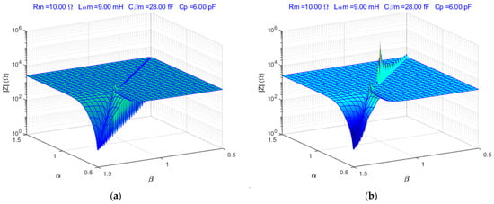 The response of the fractional order BVD model changes significantly at parallel resonance when the parallel capacitance is considered, as illustrated in Figure 2b. The FOC is unique when compared to integer-order calculus, where the aforementioned surfaces are compressed to a single point ().