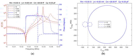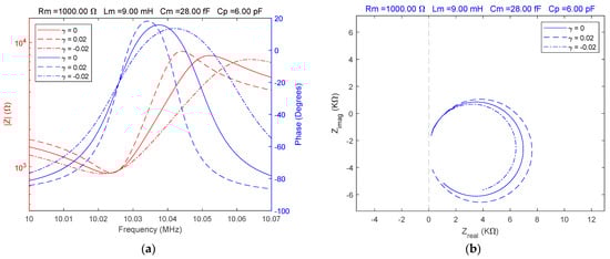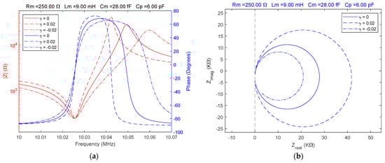 In experimental studies using impedance spectroscopy, it is necessary to investigate the response of the QCM sensor around the resonant frequencies using Bode and Nyquist plots. First, considering a typical situation for a QCM sensor located in air, a reference for impedance spectroscopy was established. The Bode and Nyquist plots illustrate the response of the QCM sensor in this case. If or equivalently, , the fractional order BVD model is equivalent to the standard BVD model. The values of the electrical parameters of the fractional order BVD model were chosen to be equivalent to the experimental parameters of a QCM sensor with a serial resonance frequency of about 10 MHz. The behavior of the QCM sensor was simulated for values of and the results are shown in Figure 4.