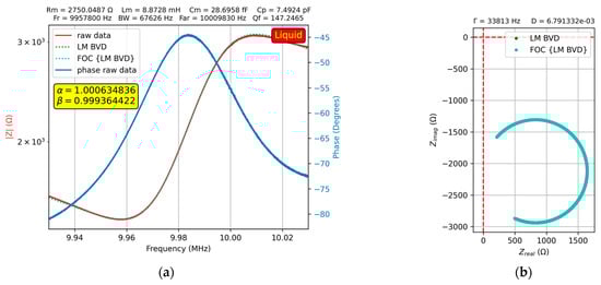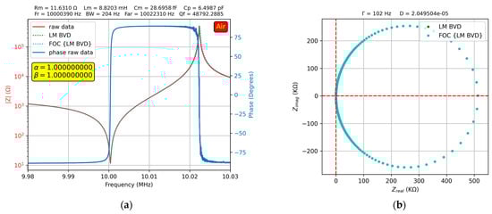 The experimental study in air involved the following steps: (i) BVD compensation of the VIA [28] in air followed by verification of the compensation using the fractional order BVD model [38]; (ii) determination of the BVD parameters in air based on the experimental resonance frequencies [28]; and (iii) using the Levenberg–Marquardt (LM) algorithm to fit the BVD model and fine-tune the raw electrical parameters. To evaluate the fractional order effect, the value of the electrical parameters of the previously determined BVD model was considered, and a rerun with the fractional order BVD model was performed. Again, the LM algorithm was used, but only fractional order parameters were used for the fit. The results of the procedures described above in the referenced case when the QCM sensor was in air are shown in Figure 8.