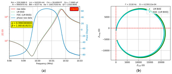As shown in Figure 8a, the use of the fractional order BVD model was not justified because in this case. Moreover, this has been demonstrated in [38], in which the evaluation of VIA compensation using the FOC was investigated. To achieve a high accuracy in the optimal VIA compensation procedure, it is recommended to use the raw electrical parameters determined based on the experimental resonance frequencies without refining them using the LM algorithm. In this situation, the obtained values are very close to the integer-order value, but are slightly affected by experimental uncertainty. The high-accuracy experimental results allow us to conclude that the QCM sensor does not exhibit fractional order behavior in air as long as the VIA is optimally calibrated because the Nyquist plot in Figure 8b shows a perfect overlap between the two BVD models.