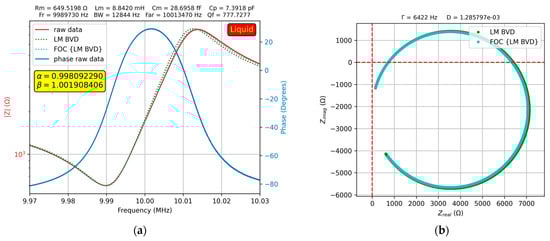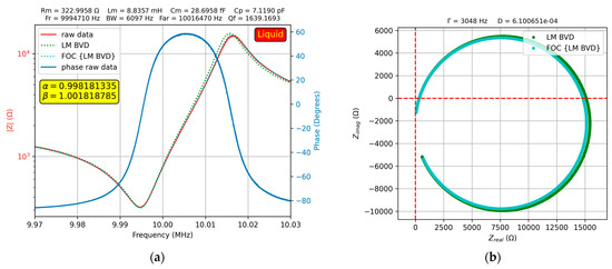 In addition, in Figure 9b, the Nyquist plot shows the difference in fit between the BVD model and fractional order BVD model. The measurement procedure was the same as that in air, and the value of the motional capacitance, , was kept constant in liquid media according to standard BVD methodology.