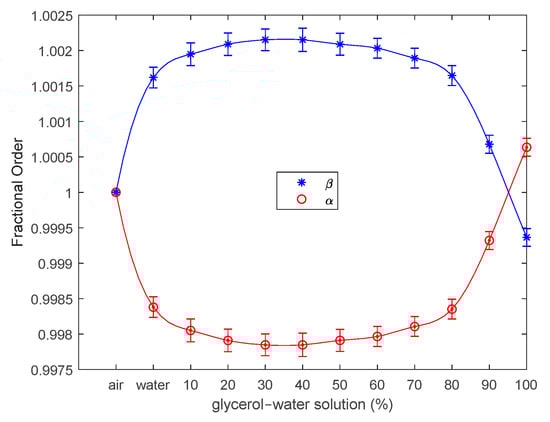 As shown in Figure 14, the fractional order effect of the liquid working medium on the QCM sensor was experimentally demonstrated. For each experimental situation investigated, five measurements were performed, the experimental errors were negligible (error bars), and there was no effect induced by experimental uncertainty or thermal drift. In each case investigated experimentally, the fit of the experimental data to the fractional order BVD model was better than that to the BVD model. Apparently, the fit is acceptable for both models at glycerol–water solution concentrations greater than 80%. This is owing to the high value of the motional resistance, , as well as a decrease in the fractional order parameter values, as illustrated in Figure 14.
