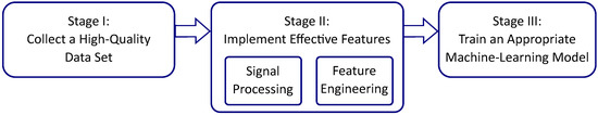 The second stage, especially the feature engineering part, is the most time-consuming step in developing a machine-learning algorithm and often impacts the outcome quality more than the machine-learning model used [11]. Good features can express significant class differences. Models with too many features are less interpretable, computationally inefficient, and may suffer from overfitting [10,12]. The process of finding the optimal set of features that improve the model effectiveness is called feature engineering [10].