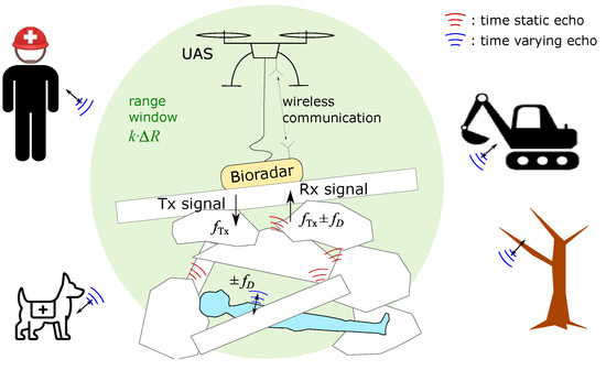 Figure 2 depicts the complex operational environment of a rescue bioradar. There are usually many moving entities in disaster areas, such as first responders, rescue dogs, and machines. They may interfere with the bioradar measurements. However, by employing a range window, we can separate the signal of the trapped individual from interfering signals that occur at different distance intervals. The range resolution depends on the bandwidth of the applied radar signal and the propagation velocity c of electromagnetic (EM) waves in medi:.