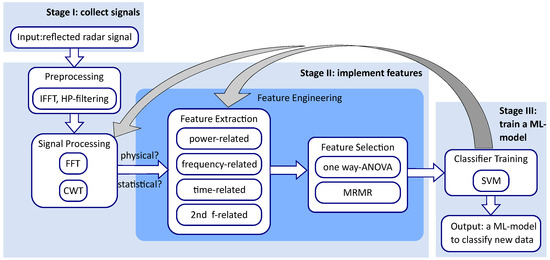 Although the extraction is a creative process, some directions can guide us to extract candidate features more systematically. In the case of radar sensor signals, features can be divided into physical and statistical features. For time-varying signals, features can be derived from time-domain, frequency-domain, and time-varying-frequency representations [19]. Furthermore, according to their associated physical quantities, they can be categorized into time-related, frequency-related, and power-related features. In Section 4, the extraction of candidate features using these categories will be introduced in detail.