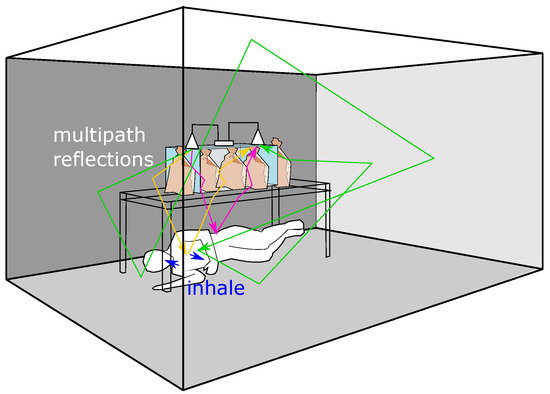 Schematic diagram of the laboratory with experimental set-up. A test person lies in a “right lateral” position. The blue arrows illustrate the deformation of the human body during inhalation. The transmission and reflection of RF waves can take any path in the room. Here we illustrate some possible paths with yellow, rose-red, and green colors. In the illustration, the rose-red colored path is the shortest, RF waves propagate through the box with brick bags and the table, hit the person’s waist then return. The green path is the longest, however, the waves in this path mainly travel through the air, reaching and reflecting perpendicular to the person’s chest.