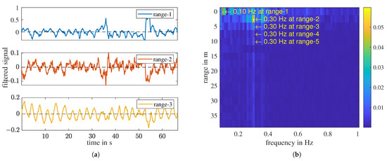 A measurement of “with person”. (a) Sub-signals of the first three range intervals, high-pass filtered. (b) Frequency—range plot. In the range 1 to 5, the FFT-determined respiratory frequency is labeled.