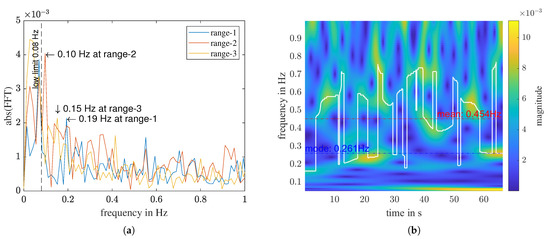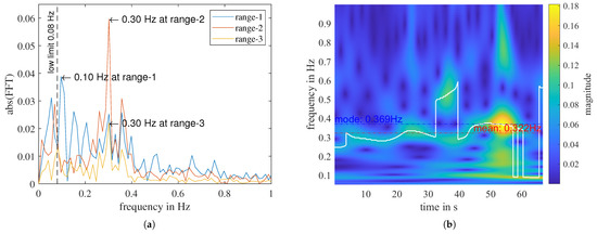 In this measurement, for range-2 to range-5, is detected at 0.3 Hz. However, in range-1, it is detected at Hz due to a low-frequency remainder despite the applied high-pass filter, which can also be seen in the FFT spectrum shown in Figure 8a. Apart from the static remainder, signal discontinuities can cause FFT distortion, leading to inaccurate determination of the respiratory frequency. These signal disruptions may arise from factors such as temporary breath-holding or body movement. To overcome this challenge, we utilize a second transform, the continuous wavelet transform (CWT), which enables us to track quasi-periodic components over time closely. The time-frequency distributions (TFD) of the CWT of the three sub-signals shown in Figure 7a are given in Figure 8b and Figure 9a,b, respectively.