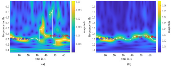 The “with person” measurement shown in Figure 8. (a) CWT of range 2. (b) CWT of range 3. The biggest peak f_cwt at each time point is highlighted with the white curve, . The mode and mean of is noted on the plot with a dotted line, respectively.