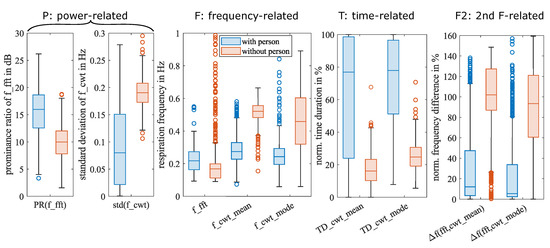 The box in the box plot represents the interquartile range, which includes 50% of the samples. The distance between the boxes representing “with person” and “without person” indicates the classification potential of each feature. A larger distance between the boxes suggests a stronger potential for classification. For instance, the boxes for f_cwt_mean are further apart than those for f_cwt_mode, which implies that f_cwt_mean is a more significant feature than f_cwt_mode.