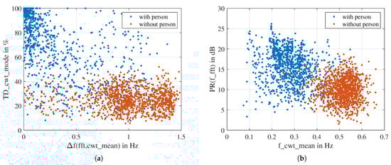 We chose a fixed interval width of 0.1 Hz instead of a floating value dependent on the f_cwt_mode because the average standard deviation of for “with person” is approximately half of that for “without person”. In our later analysis, we will demonstrate that the mean standard deviation of for “with person” measurements is 0.09 Hz, which is approximately equal to the interval width of 0.1 Hz, whereas for “without person” measurements, it is 0.19 Hz. Consequently, we can expect that with an interval width of 0.1 Hz, the TD_cwt_mode would exhibit statistically significant differences between the two classes of measurements.