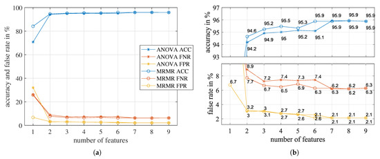 Figure 14a shows the classification accuracies (ACC), false negative rates (FNR), and false positive rates (FPR) of the trained SVM models. Figure 14b zooms in on the accuracies and false rates, respectively. For both rankings, the classification accuracy improved significantly by increasing the number of features from one to three. After three features, for MRMR ranking, the most significant improvement of 0.6% occurs when the number of features is increased from five to six, which indicates the 6th feature is essential. For the one-way ANOVA ranking, the most significant improvement of 0.7% occurs at the 7th feature.