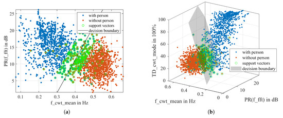 Several models without these constraints can be applied to our problem. The accuracy and performance of a classifier are heavily influenced by the features used, so the focus of this contribution is primarily on feature engineering. We ultimately chose to use SVM due to its robustness and ability to produce easily interpretable decision boundaries [22,23], which is particularly useful for a problem with complex measuring conditions and continuous features. In Section 6, the results of this work are presented, including the hyperplane functions of the trained SVM models and the effect of signal prominence ratio and test person’s body position on the detection accuracy.