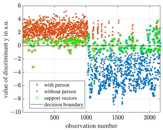 For the 4D-LSVM model, we cannot visualize the 4D scatter plot and the 3D hyperplane. However, as illustrated in Figure 16, we can transform the 4D-feature space into a 1D-function as described in Equation (17), and the hyperplane is the point . The observations with are classified as “with person” and the observations with are classified as “without person”. The larger the magnitude of , the more confident the prediction is.