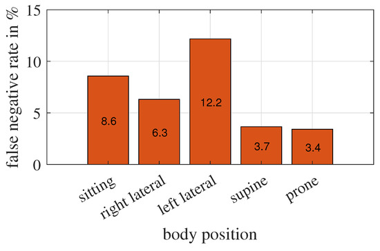 The radar measures downwards. In the supine and prone positions, the chest or back movement of the test person is axial to the radar, resulting in the most significant change in the radar cross-section. Measurements of these two body positions have also the lowest FNR. Similarly, we would expect that in the sitting position, the chest movement is perpendicular to the propagation direction of the radar wave, which causes a minimal change in the radar cross-section, therefore, is hardest to detect. However, observations of the left lateral position have the lowest accuracy. Their FNR is nearly doubled compared to the observations of the right lateral position, which seems strange but consistent with our discussion in Section 3.2. The experimental set-up is asymmetric and closer to the wall with the heater on the left side of the lying test person. The space on the right side is more open, and radar waves reach the person more easily from the right side than from the left.