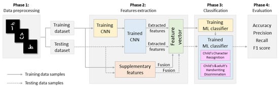 In this study, we conducted two different tasks, handwritten character recognition and writer-group classification. Figure 1 shows the framework designed to achieve the suggested approach for recognizing children’s handwritten Arabic characters and classifying them into a child or an adult writer group. The proposed approach is divided into four phases: data preprocessing, feature extraction using CNN and other supplementary features, classification using three additional popular ML-based classifiers, and evaluation of the results and model performance using standard assessment measurement techniques. The following subsections provide more information on each of these four stages.