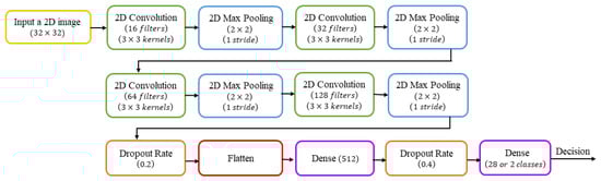 As shown in Figure 2, the suggested CNN model to extract features has ten layers, comprising four convolution layers, four max-pooling layers, and two fully connected layers. The input is a grayscale image for the child’s character recognition task and a binary image for the child’s handwriting discrimination task from the adult’s handwriting as a writer’s group, both images with a size of 32 × 32. All convolution layers use a 3 × 3 kernel, one stride, padding equal to the same input size, and a ReLU activation function that converts (an input feature value) less than zero to zero, as defined in Equation (1).