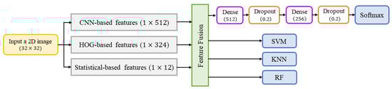 After the CNN model was trained and tested, we used it as a major feature extractor by replacing the final output FCL (Softmax classifier) with three well-known ML-based SVM, KNN, and RF classifiers for performance variation measurement and comparison purposes across all experiments. The feature vector obtained from the trained CNN consists of 512 features when trained on child data, adult data, and both for the children’s character recognition. For the writer-group classification task, we used the feature fusion method to supplement CNN-extracted features with statistical-based features, with HOG-based features, and with both. The feature vector obtained from the statistical-based feature extractor constitutes twelve features, while the one obtained from the HOG-based feature extractor comprises 324 features. All these extracted features were normalized to range from 0 to 1 using min-max normalization. The fused feature vector was initially trained and evaluated using the Softmax classifier by constructing a feed-forward neural network (FFNN) with six layers. The first layer is the input layer showing the number of features in each feature vector, while the remaining layers are illustrated in Figure 4. All these extracted features were then trained by the ML classifiers. After training, the trained ML classifiers were used for testing in the classification phase for children’s handwritten character recognition and children and adult handwriting discrimination with/without supplementary features.