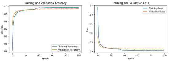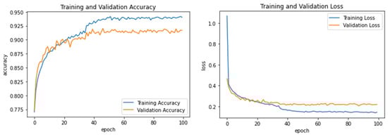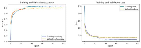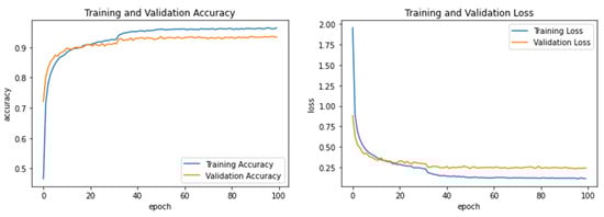 Experiment 1 was conducted to show how the proposed model performed after being trained and tested on the Hijja dataset alone. The results of this experiment are presented in Table 7. Furthermore, the accuracy and loss curves of the training and validation are shown in Figure 5. The model achieved the best performance with an accuracy of 91.95% using the SVM classifier with radial basis function (SVM-RBF) kernel values set to (C = 100 and gamma = 0.001). The RF classifier reported the second-highest accuracy at 91.87%, while Softmax and KNN achieved the lowest performance compared to the others. It is worth noting that the hyperparameter of the KNN was set to Manhattan distance and k = 5, and the RF was set to n_estimators = 300 and max_depth = 30.