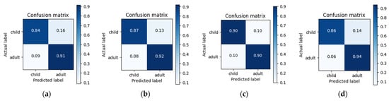 The results of Experiment 4 were also analyzed and validated using the confusion matrix, as shown in Figure 9. Hence, we observed that the RF classifier, shown in Figure 9d, outperformed the Softmax, SVM, and KNN classifiers by achieving 94% accuracy for accurate adult classification and only 6% of adults were misclassified as children. Nevertheless, the best child classification accuracy was 90% using the KNN classifier, as shown in Figure 9c, whereas only 10% of the child samples were misclassified as adult ones.