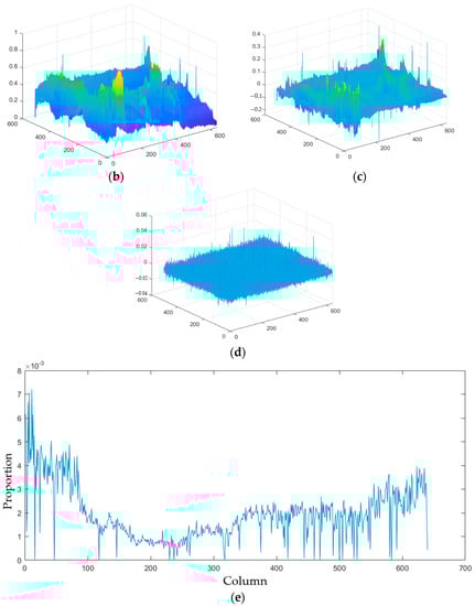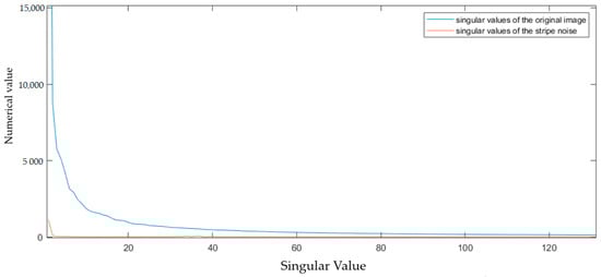 Through an examination of Figure 2, it can be observed that the weight ratio of the salient component, , is relatively small in the first several singular values. Meanwhile, detailed texture information of the image is contained in the singular values with smaller numerical values and occurs later in the order []. Subsequently, experiments are conducted to analyze which singular values in the LatLRR decomposed image matrix represent the stripe noise information captured in the original image. It is worth noting that the left and right singular matrices utilized for the singular value decomposition of the stripe noise matrix at this stage are the same as those used for the singular value decomposition of the original image.