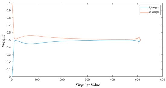 In this, we can observe that the fundamental principle underlying the separation of the low-rank and salient parts in the decomposition Formula (3) is the weighted processing of the singular values of the original image based on their relative magnitudes. Mappings of and with different weights for singular values of diverse magnitudes are utilized; meanwhile, suppresses the weight component associated with a larger . Afterward, the weight ratios of and separated from a noisy infrared image are illustrated in Figure 2.