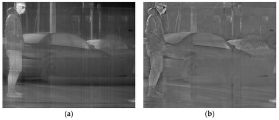 The extraction of positive matrix elements from the salient component matrix LX is represented by , which is followed by a linear mapping to the [0-1] interval. The mapping scale factor for is defined as the coefficient , which ranges from 0 to 1. To ensure that the extracted images are not distorted, the value of is chosen to satisfy Formula (6)‘s condition while being maximized. Details are extracted from the image without distortion using this method, as illustrated in Figure 6. Repetitive multi-level image decomposition is performed by subtracting the extracted information from the original image using , and they are using it as an input for the next level of LatLRR decomposition. As a result, the image details that are contained in the negative elements of the salient component matrix that were not extracted in previous levels are continuously extracted in subsequent levels. Hence, this method effectively extracts maximum information from noisy infrared images without distortion.