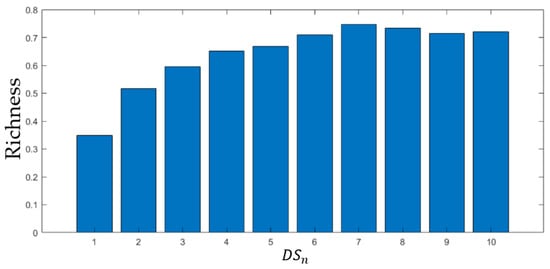 Convolutions with the Laplace edge detection operator [] were separately performed on and the original image. The ratio of L1 norms after convolution was used to represent the richness of the salient part images extracted from the first n levels. As all the salient part images do not contain stripe noise, the L1 norm of the convolved sum of the salient component images, , must be smaller than that of the original image. Theoretically, when reaching a certain level of decomposition, this ratio will be fixed around a certain value, fluctuating around this value but not approaching 1. The difference between this ratio and one mainly comes from the L1 norm difference caused by stripe noise in the original image after convolution with the operator.