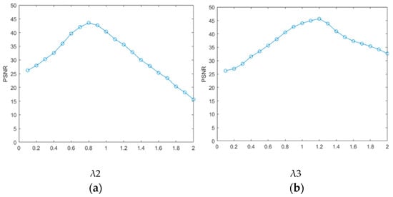 Influence of regular terms on the PSNR: (a) relationship between λ2 and PSNR; (b) relationship between λ3 and PSNR.