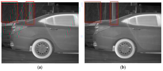 Denoising effects of ablation experiment on an image of a car: (a) Non-MIDILatLRR; (b) proposed method.