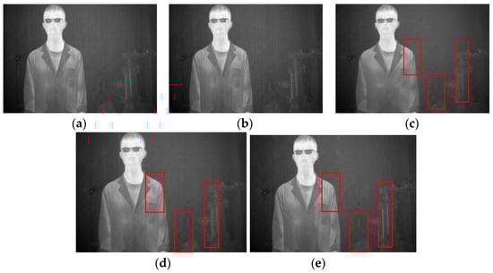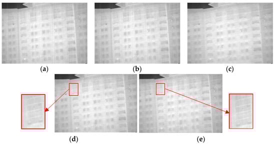 Four different infrared images were selected as experimental objects to demonstrate the universality and effectiveness of the proposed method. The first image, as shown in Figure 11a, contains a human figure with a significant grayscale difference from the background and an object with vertical edge features with a small grayscale difference from the background. In the second image, depicted in Figure 11b, the main structure of a wall in a building is included, in which the texture details have a small grayscale difference when compared to the stripe noise, and there are numerous small vertical detailed textures in the windows and wall structures. The third image, illustrated in Figure 11c, contains a vehicle with relatively smooth information and fewer vertical texture features. Lastly, the fourth image, displayed in Figure 11d, depicts a complex scene comprising human figures, vehicles, trees, and the ground, in which the texture information is intricate and subtle objects with vertical texture features exist. All four images contain various stripe noises with different grayscale and intensity, and large amounts of effective texture information have low contrast with the stripe noise. Resultantly, it is sufficiently demonstrated that the proposed method can attain excellent results.